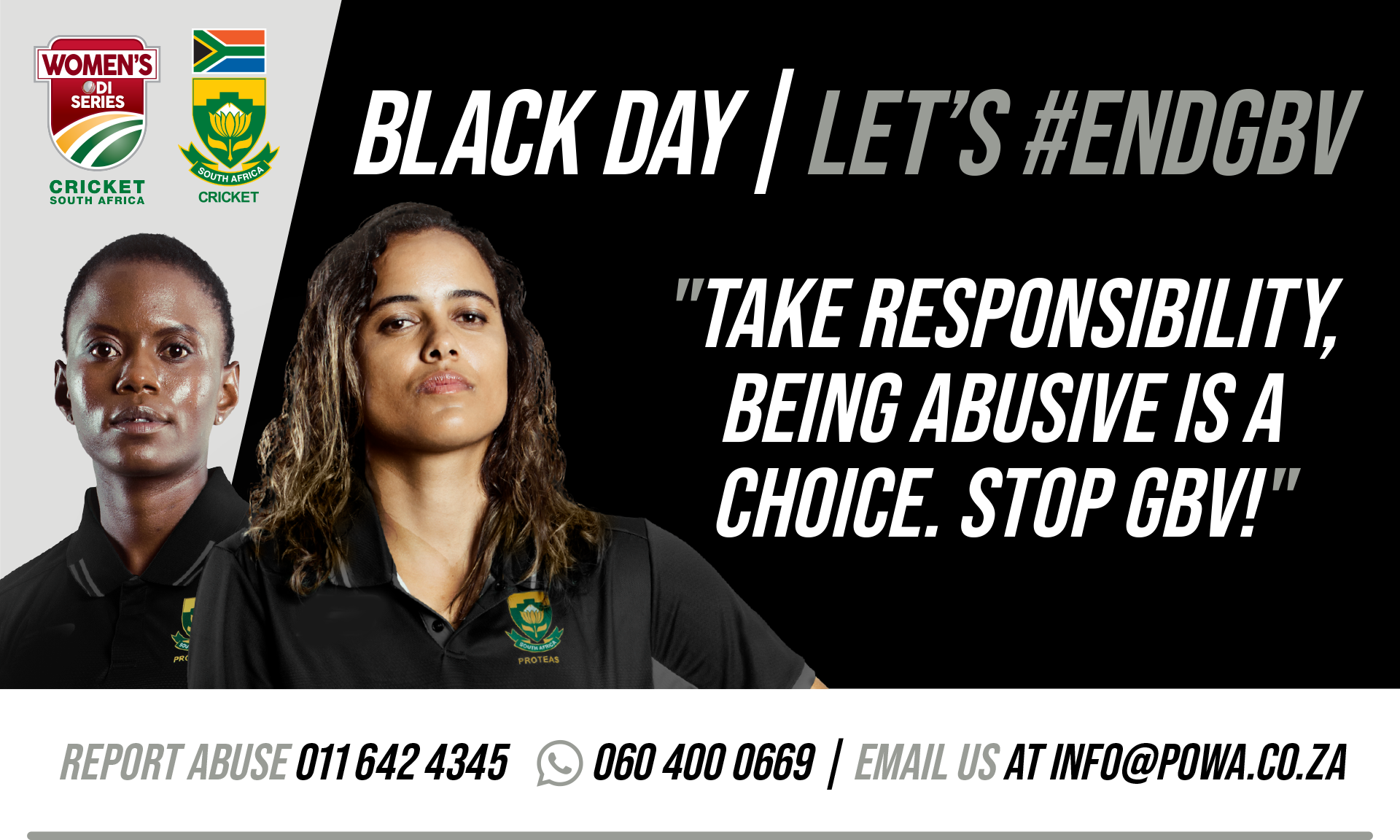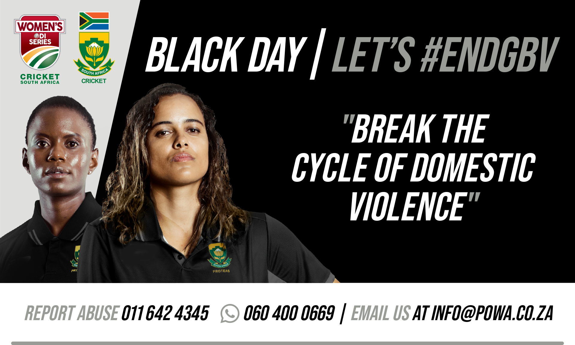 Black Day is a day where our Proteas Women’s team dresses in Black as part of its inbound bilateral tour One Day International to raise awareness and rally the public and fans to show their support as part of ending this scourge.